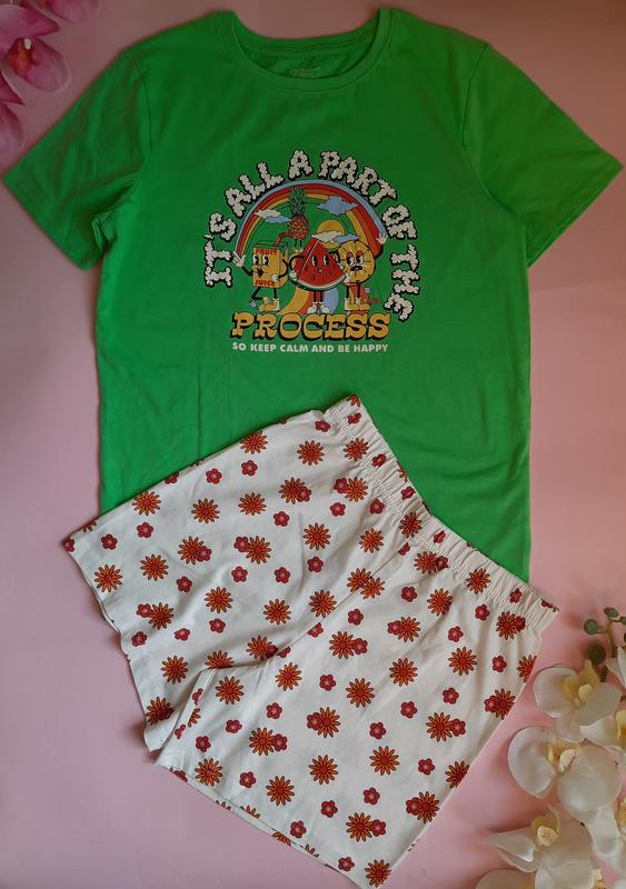 12-13 лет/ 158 см. Подойдет на размер XS/S. Яркая пижама с шортиками от Primark. 100% бавовна Приятный трикотаж. Цвет футболки камеры почему-то не передает точно: в реальности она светло- салатовая. Замеры: - между плечами 39 см - под рукавами 47 см - Длина по спине 64.5 см - Ширина шорт в поясе, не растягивая, 34 см; тянется до 47 см - Ширина в стегнах 45 см - Длина шорт 37 см Без бумажной этикетки. Нова.