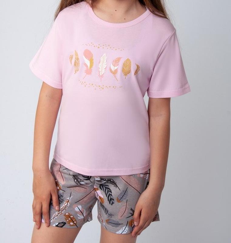 Легка зручна піжама для дівчаток з однотонного та принтованого куліру. Модель вільного крою, складається з футболки з короткими рукавами, зі спущенною лінією плеча, округлою горловиною, а також шорт на еластичній тасьмі. Завдяки натуральному складу полотна (100% бавовна) ця піжама стане улюбленою річчю в домашньому гардеробі дівчаток, а асортимент модних принтів задовольнить будь-яку модницю. Також є можливість придбати схожу модель жіночої піжами для створення Family look. Зріст 98-128см. Полотно: кулір. Склад: 100% бавовна. Рекомендації з догляду: прати при температурі не більше 30°C. Допускається прання в режимі "ручне" або "делікатне", принт прасувати тільки по виворонтій стороні.