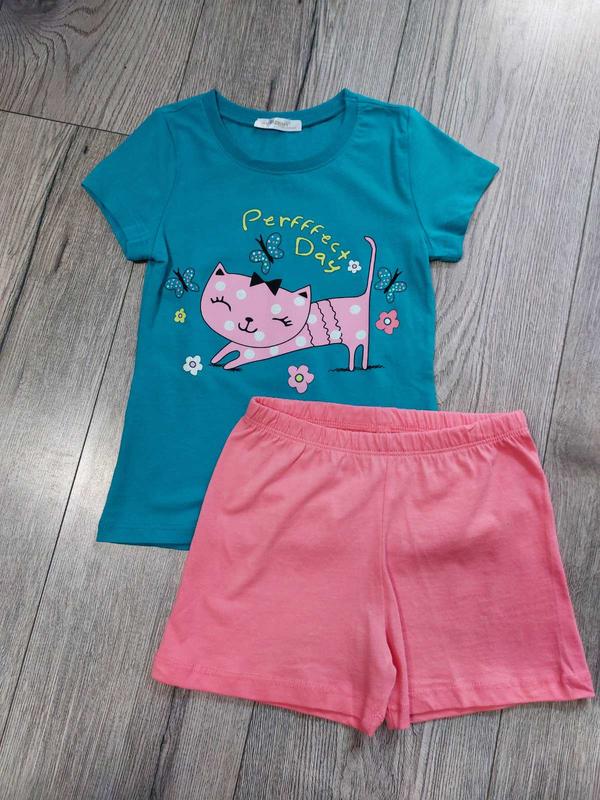 Пижама для девочек, с котиком. Состав: 100% - хлопок. Может использоваться в качестве комплекта футболка + шорты.