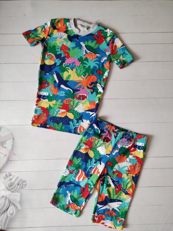‼️ Безпечною оплатою не відправляю Домашній комплект піжамка в морській тематиці, тканина середньої щільності,не тоненька. Колір яскравий,не зіпраний. На футболці є шнурочок від бірки. 📐Футболка подовжена Довжина 54 см, ширина 35,5 см, добре тягнеться. 📐 Шорти подовжені Довжина 46 см, пояс резинка 28 см, крок 26,5 см, посадка