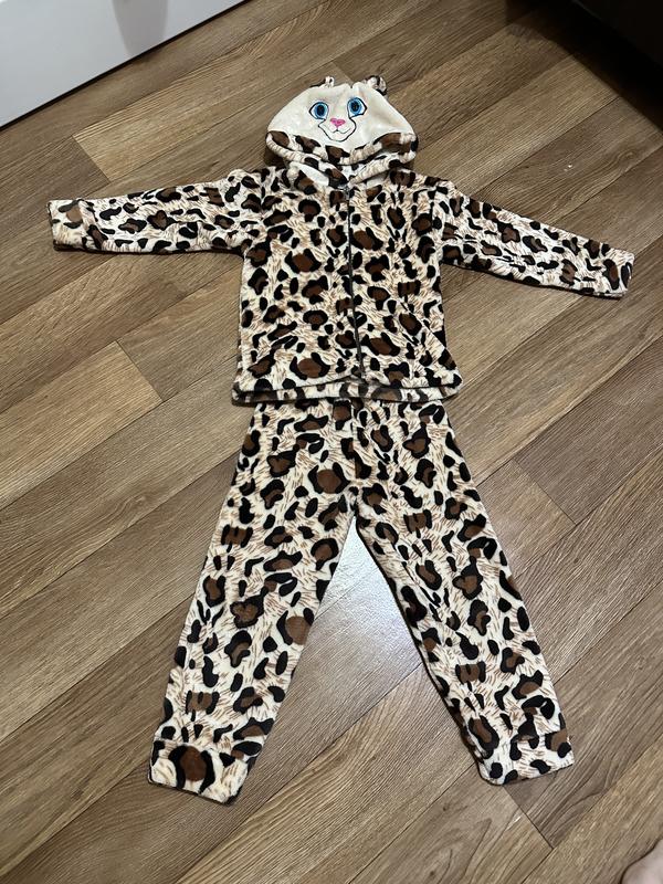 Очень мягкая, теплая пижама или домашний костюм Замеры: Длина штанов 59 см Пояс резинка 16, тянется очень хорошо 30+ см Длина кофты 43см Рукав от горловины 44 см Есть пару мест где разошлась ниточка по шву( верх) нужно подшить. В остальном состояние идеальное .