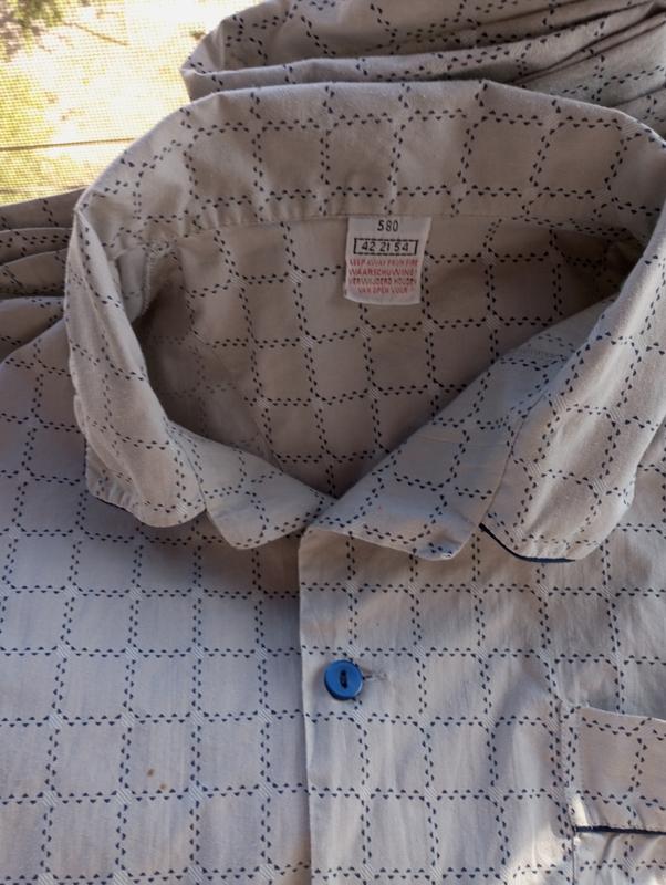 Пижама, пиджак и штаны.На пиджаке есть три кармана.застежка на пуговицах.По краю пиджака Кант.Штаны прямые,пояс на резинке, размер ХХXL