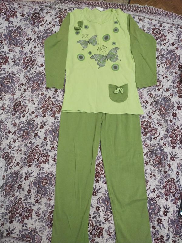Ткань не тонкая, средней толщины. Почти не тянется. Замеры: кофта - длина - 58, ширина подмышками - 41,5, длина рукава - 42, ширина плеч - 39 см; брюки - длина - 85, ПОБ - 44, ПОТ - 29/ тянется до 42 см. Дополнительные фото и видео по запросу. Пересылаю Новой и Укр-почтой. Возвращение возможно за счет покупателя после просмотра на поште.