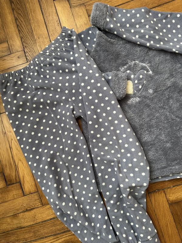 Детская пижама, очень теплая, серого цвета, на кофточке милый принт, штаны в горошек