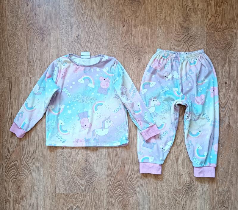 Тепленькая пижама для девочки в идеальном состоянии без дефектов. Мягкая ткань, приятная на ощупь. Красиво тянется. Брюки длина 49, шаг 31, пояс резинка 19+ тянется до 35, посадка перед 20. Кофта: длина 36, ширина под руками 33, рукав от плеча 33, рукав от шеи 40