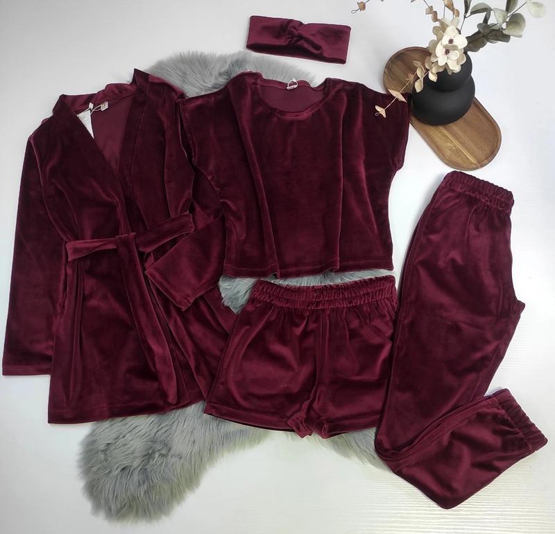 🧡В наличии 🧡 Мега новинка Комплект 5в1 Ткань королевский велюр В комплект входять: -футболка-топ, -шорти -штани -халат с поясом -повязка КАЧЕСТВО СУПЕР! ПОЛНОМЕРНЫЕ!!! замеры:халат длин/рукав/пог/футболка длин/пог/понтаны длин/шак/пояс/шорты длин/пояс 134р-62/47/41/40/42/80/60/25/26/25 158р-75/58/50/49/48/102/78/29/32/29
