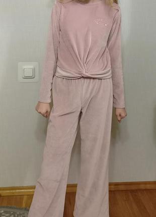 Продам велюровую пижаму пудрового цвета для девочки 11-13 лет на рост 142-147 см. Ориентируйтесь по замерам. ПОГ 43 см, ПОТ 38 см, плечи 32 см, рукав 56 см, длина 47 см. Штани ПОТ 30-35 см, ПОБ 45-49 см, длина 90 см Дефектов нет.