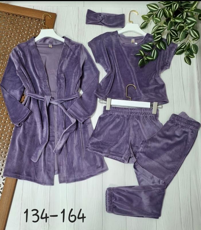 Мега новинка Комплект 5в1 Ткань королевский велюр В комплект входять: -футболка-топ, -шорти -брюки под РЕЗИНКУ -халат с поясом -повязка КАЧЕСТВО СУПЕР! ПОЛНОМЕРНЫЕ!!! 🌷134(2 шт)-длина халата 69,рукав 47,пог 41,длина футболки 40, пог 42,длина брюк 80,крок 60,пояс 25,длина шорт 26,пояс 25 🌷140(1 шт)-длина халата 71,рукав 48, пог 43, длина футболки 42, пог 43, длина брюк 86, крок 65,пояс 26,длина шорт 27,пояс 26 🌷146(3 шт)-длина халата 77,рукав 50, пог 44, длина футболки 46, пог 45, длина брюк 92, крок 70,пояс 27,длина шорт 28,пояс 27 🌷152(2 шт)-длина халата 81,рукав 52, пог 48, длина футболки 47, пог 47, длина брюк 98, крок 73,пояс 28,длина шорт 30,пояс 28 🌷158(3 шт)-длина халата 83,рукав 57, пог 50, длина футболки 49, пог 48, длина брюк 102, крок 78,пояс 29, длина шорт 32,пояс 29 🌷164(3 шт)-длина халата 86,рукав 60, пог 51,длина футболки 51,пог 50,длина брюк 105,крок 82,пояс 30,длина шорт 33,пояс 30 +-2 см