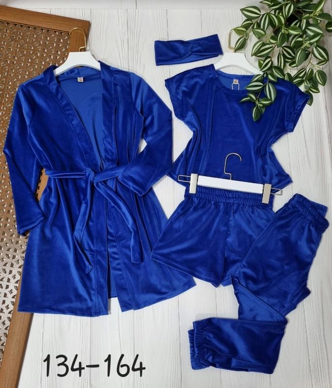 В НАЯВНОСТІ Мега новинка Комплект 5в1 Ткань королевский велюр В комплект входять: -футболка-топ, -шорти -брюки под РЕЗИНКУ -халат с поясом -повязка КАЧЕСТВО СУПЕР! ПОЛНОМЕРНЫЕ!!! 🌷134(3 шт)-длина халата 69,рукав 47,пог 41,длина футболки 40, пог 42,длина брюк 80,крок 60,пояс 25,длина шорт 26,пояс 25 🌷140(1 шт)-длина халата 71,рукав 48, пог 43, длина футболки 42, пог 43, длина брюк 86, крок 65,пояс 26,длина шорт 27,пояс 26 🌷146(1 шт)-длина халата 77,рукав 50, пог 44, длина футболки 46, пог 45, длина брюк 92, крок 70,пояс 27,длина шорт 28,пояс 27