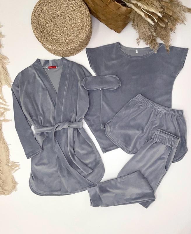 Велюровая пижама из 5 предметов СУПЕР КОМПЛЕКТ! -халат с поясом и карманами -футболка -шорти -брюки с карманами -маска на глаза ОТМЕННАЯ КАЧЕСТВО! рост/длин.халата/пог/рукав от горловины/длин.ф./пог/длин.шорт/пот/дл.штанов/крок/пот/поб 134/72/48/56/51/41/29/27/86/66/26/48 140/75/49/58/52/41/29/28/88/67/27/49 і