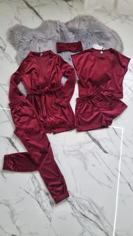 СУПЕР КОМПЛЕКТ! Велюровая пижама 5 в 1 халат с поясом футболка-топ шорты штани Повязка на голову Ткань - королевский велюр. Замеры: 134 халат длина - 62см, полуобхват груди - 41см, рукав от плеча - 47см. брюки длина - 80см, шаг - 60см, пояс - 25см. футболка длина - 40см, полуобхват груди - 42см. шорты длина - 26см, пояс - 25см. 140 халат длина - 63см, полуобхват груди - 43см, рукав от плеча - 48см. брюки длина - 87см, шаг - 66см, пояс - 26см. футболка длина - 42см, полуобхват груди - 43см. шорты длина - 27см, пояс - 26см. 146 халат длина - 70см, полуобхват груди - 44см, рукав от плеча - 51см. брюки длина - 92см, шаг - 71см, пояс - 27см. футболка длина - 46см, полуобхват груди - 45см. шорты длина - 28см, пояс - 27см. 152 халат длина - 72см, полуобхват груди - 48см, рукав от плеча - 52см. брюки длина - 98см, шаг - 73см, пояс - 28см. футболка длина - 47см, полуобхват груди - 47см. шорты длина - 30см, пояс - 28см. 158 халат длина - 75см, полуобхват груди - 50см, рукав от плеча - 58см. брюки длина - 102см, шаг - 78см, пояс - 29см. футболка длина - 50см, полуобхват груди - 49см. шорты длина - 32см, пояс - 29см. 164 халат длина - 77см, полуобхват груди - 51см, рукав от плеча - 60см. брюки длина - 105см, шаг - 82см, пояс - 30см. футболка длина - 51см, полуобхват груди - 50см. шорты длина - 33см, пояс - 30см.