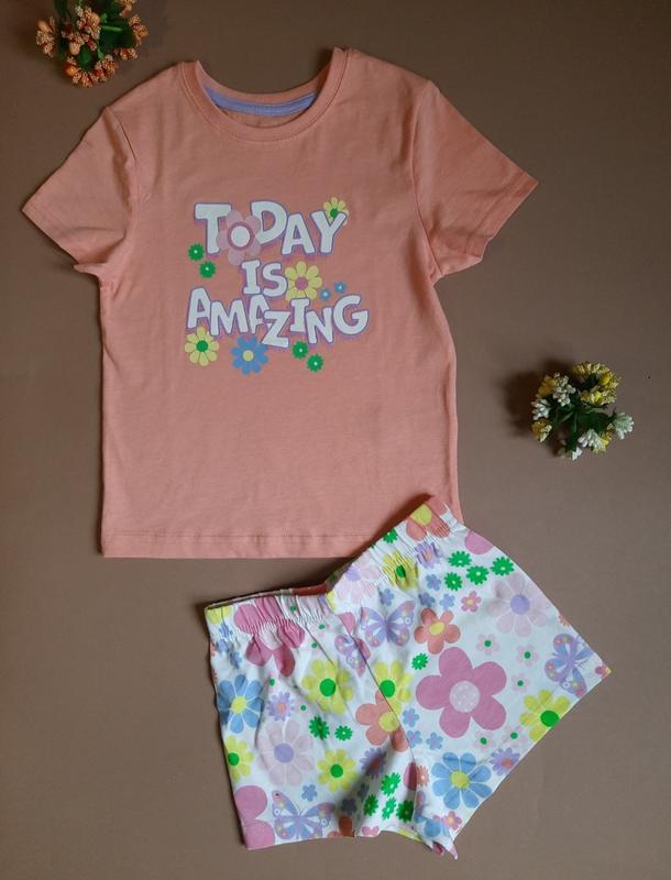 Пижама с шортиками/ летний костюмчик от Primark. Цветочный принт,надпись, блестки на футболке. 100% бавовна 3-4 года /104 см Замеры: - между плечами 28.5 см -под рукавами 32 см - Длина по спине 41 см - Ширина в поясе, не растягивая резинку, 25.5 см - посадка 22.5 см - Длина шорт 22.5 см Пижама новая. Бумажная этикетка отсутствует. Открытка по Новой почте 2-3 раза в неделю. Укрпочта раз в неделю.