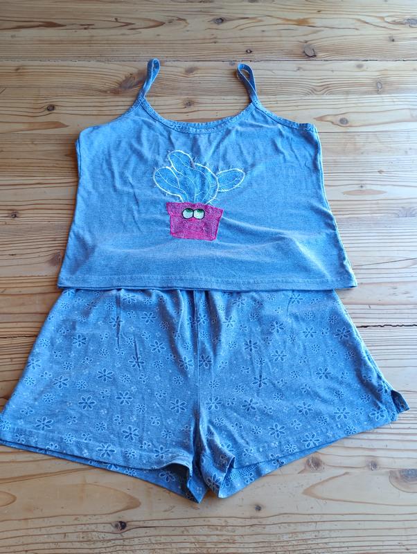 Голубая пижама: майка и шорты на девочку размер S.Замеры: майка пог 45 см, длина 54 см, шорты: пояс 35 см, длина 31 см