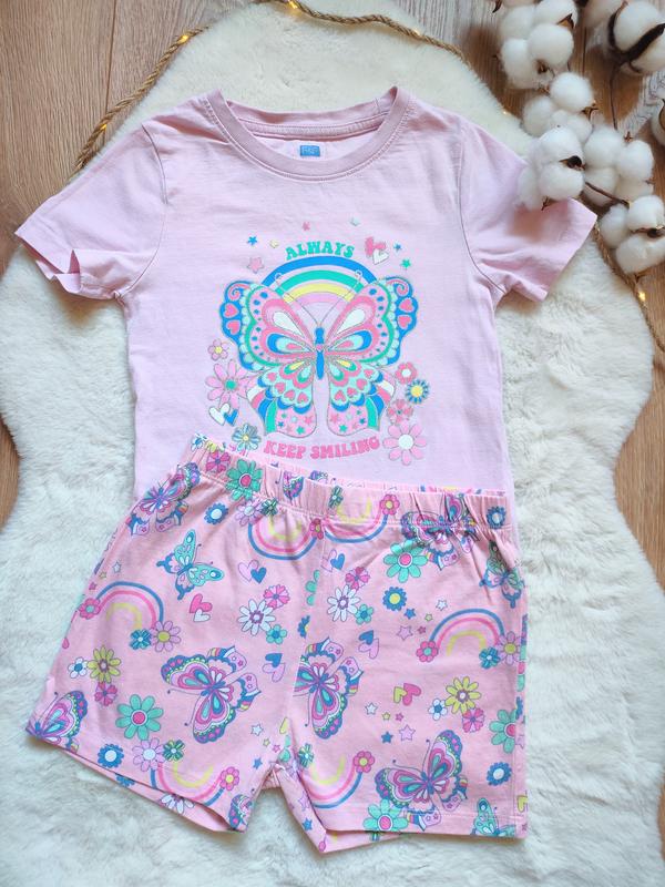 Піжама/набір для дому та сну від бренду F&F для дівчинки 4-5 років, на зріст 110 см 🌈🎀🩷💛🦋 Склад: 100% бавовна 👍 Заміри: Футболка 👚 Довжина 41,5 см Плечі 25 см Ширина під рукавами 31,5 см Шорти🩳 Довжина 25,5 см Пояс 24,5 см