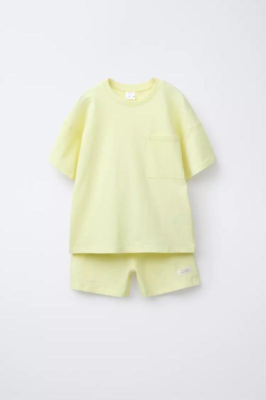 Піжамний комплект-двійка. Футболка з круглим коміром, короткими рукавами. Накладна кишеня на грудях. Шорти з еластичним поясом та шнурками спереду. Нашивка з аплікацією внизу. Виготовлений зі 100% бавовни. ЖОВТИЙ