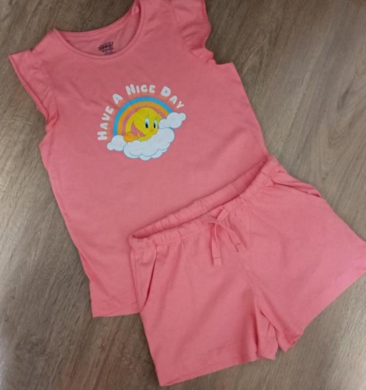 Летняя детская трикотажная пижама. Комплект состоит из шортиков и футболки Костюм изготовлен из натурального материала, который надежно сохраняет оптимальную температуру тела, позволяет коже дышать, очень приятный на ощупь. Пижама свободного кроя не стесняет движения, поэтому в ней комфортно не только спать, но и ходить по дому. В наличии размер 122-128 на 6-8роков Длина футболки -47см,дпг+35см. длина шорт22,талия по резинке -28см,шнурок рабочий, имеют 2 боковых кармашка.