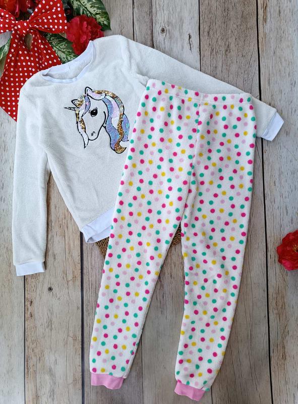 55💥супервая теплая махровая пижама для девочки, сборная, верх в идеальном состоянии, только точка одна внизу, брюки как новые 📏10/11 лет,верх длина 53, пог 42, рукав 55, низ длина 89, талия 31, шаг 61