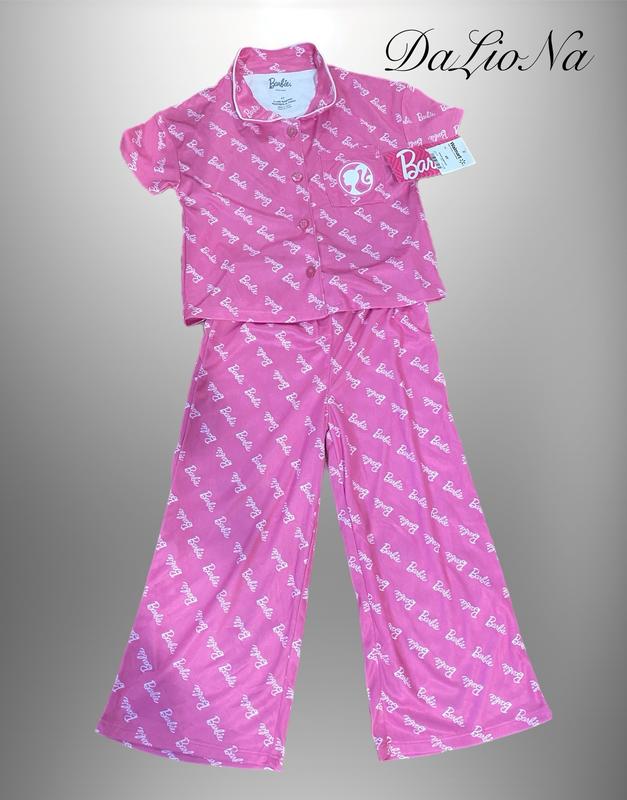 У продажі представлений рожевий комплект піжами з принтом Barbie. Він складається з: сорочки з короткими рукавами, коміром і ґудзиками по всій довжині спереду та штанів широких, вільного крою. Весь комплект прикрашений повторюваним візерунком з логотипом "Barbie". Вік: 4 роки. Заміри сорочки: - обхват грудної клітки: 29 см. - довжина сорочки по спині: 32,5 см. Заміри штанів: - довжина штанів: 55 см. - пояс: 22,5 см., тягнеться до: 33 см. Тканина: поліестер.