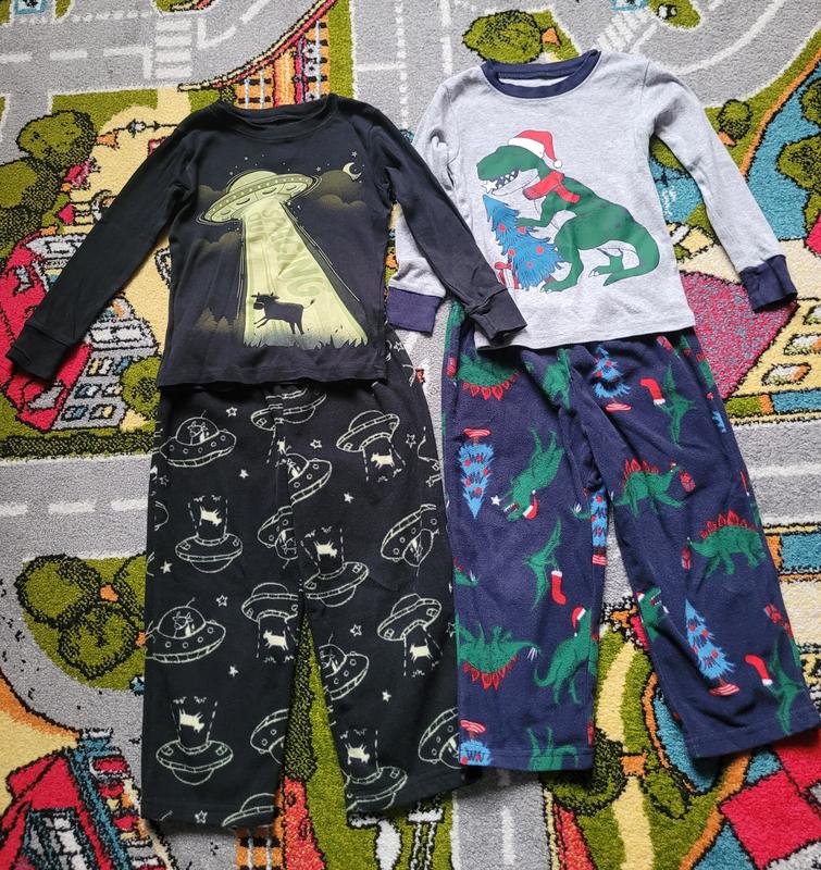 Продаю 2 пижамки Carter's (размер 98) 3 T. Пижамы в очень хорошем состоянии (на катых есть немного катышков). Брюки изготовлены из флиса, а кофта из хлопка. Пижамка (черная кофта с тарелкой) светится в темноте. Заміри на фото.