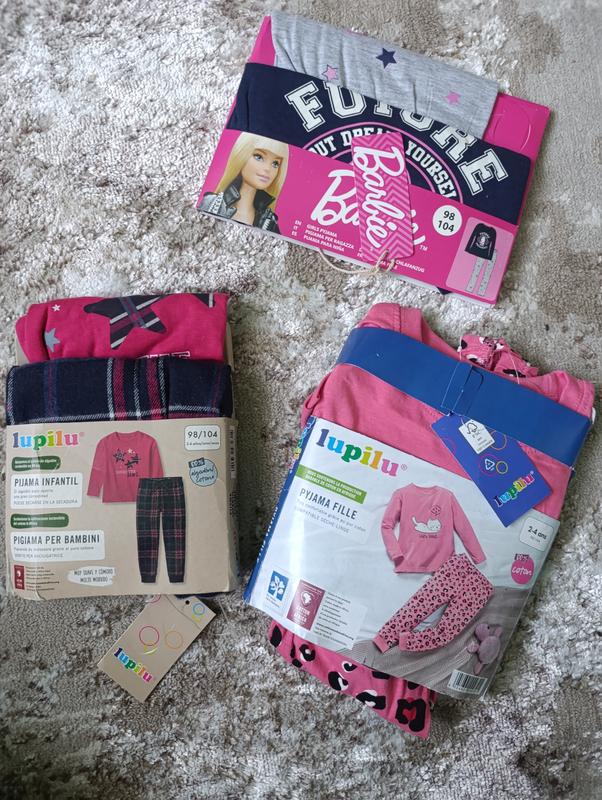 Пижамки новые Тканина: Трикотаж. Состав ткани – 100% хлопок. Пижамы от производителя Lupilu. Ткань приятная к телу, яркий рисунок не трескается. Качество очень высокое. Размер 2-4 года 98-104 см замеры на пижамку со звездочками : Кофта: Длина 42 см. Ширина 32 см. Рукав 35 см. Штани Довжина 55 см. Крок 40 цена за одну