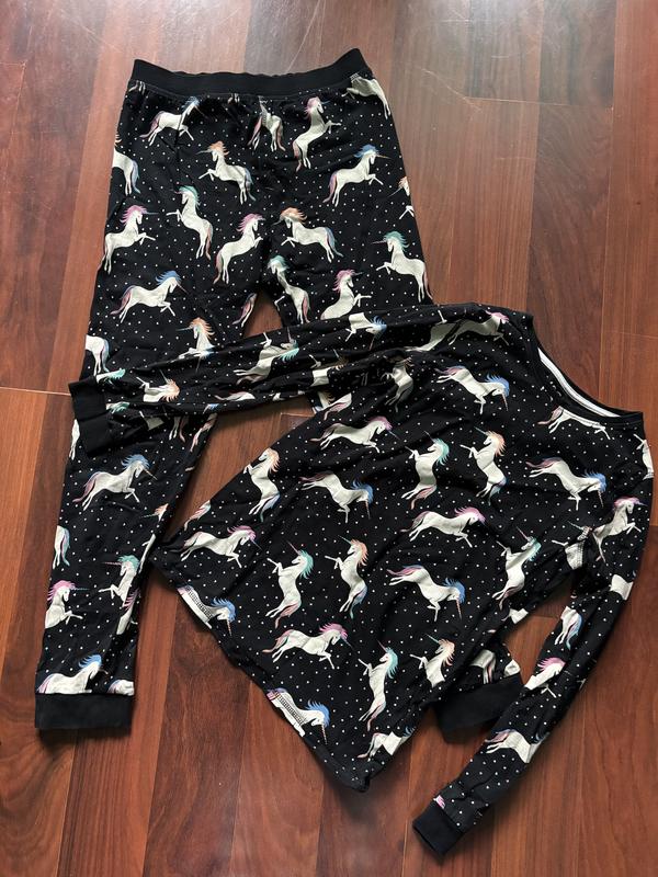 Це дитяча піжама зі 100% бавовни 🌿. Складається з кофти з довгими рукавами та штанів. Тканина приємна до тіла, дихає. Основний колір — чорний, а принт прикрашений білими єдинорогами з райдужними гривами та дрібними кольоровими цятками. Манжети на рукавах і штанах забезпечують зручну посадку. Піжама виглядає казково й створює затишок для солодкого сну 🦄💤