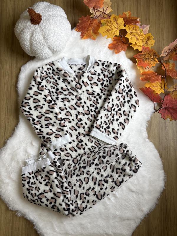 Леопардова піжамка🤎🤍 Розмір не вказано, приблизно 3 роки Крок 32 см, пояс 22см, Довж 53 см Кофта довж 37см, рукав 34см