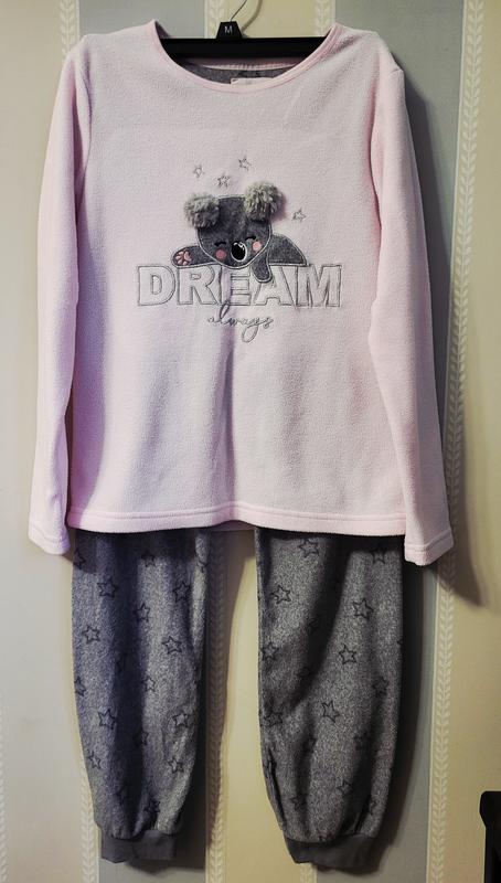 Пижама из тоненького микрофлиса, теплая и необъемная на рост 140 см в очень красивом состоянии от Primark. Штани внизу на манжетах. Замеры кофты: длина 52 см плечи 34 см рукав 50 см ширина 39 см Замеры брюк: длина 87 см пояс 28.5 см (на резиночке) крок спереду 27.5 см крок ззаду 31 см