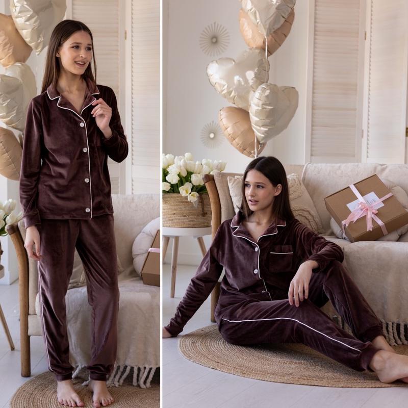 💝Затишна піжамка 🏷Размеры: 146-164 🪡Ткань королевский велюр, красиво тянется, приятная к телу, на кофточке по всей длине есть пуговицы и один накладной карман, в поясе на резинке, красиво тянется, есть карманы. Отличное качество! 📐Замеры: рубашка длина/рукав от плеча/пог/брюки длина/шак/п**********/86/65/43 152-58/54/47/90/68/45 158-60/55/49/94/72/48 164-61/56/50/96/73/50 +-2см