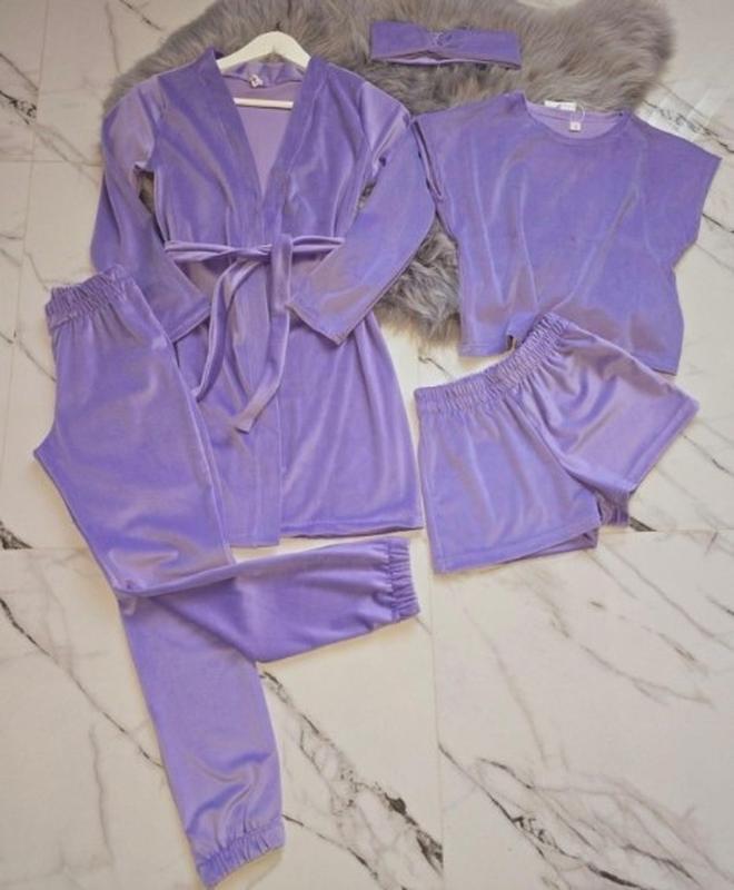 СУПЕР КОМПЛЕКТ! Велюрова піжама 5 в 1 халат з поясом футболка-топ шорти штани Пов'язка на голову Тканина - королівський велюр. Заміри: 134 халат довжина - 62см, напівобхват грудей - 41см, рукав від плеча - 47см. штани довжина - 80см, крок - 60см, пояс - 25см. футболка довжина - 40см, напівобхват грудей - 42см. шорти довжина - 26см, пояс - 25см. 140 халат довжина - 63см, напівобхват грудей - 43см, рукав від плеча - 48см. штани довжина - 87см, крок - 66см, пояс - 26см. футболка довжина - 42см, напівобхват грудей - 43см. шорти довжина - 27см, пояс - 26см. 146 халат довжина - 70см, напівобхват грудей - 44см, рукав від плеча - 51см. штани довжина - 92см, крок - 71см, пояс - 27см. футболка довжина - 46см, напівобхват грудей - 45см. шорти довжина - 28см, пояс - 27см. 152 халат довжина - 72см, напівобхват грудей - 48см, рукав від плеча - 52см. штани довжина - 98см, крок - 73см, пояс - 28см. футболка довжина - 47см, напівобхват грудей - 47см. шорти довжина - 30см, пояс - 28см. 158 халат довжина - 75см, напівобхват грудей - 50см, рукав від плеча - 58см. штани довжина - 102см, крок - 78см, пояс - 29см. футболка довжина - 50см, напівобхват грудей - 49см. шорти довжина - 32см, пояс - 29см. 164 халат довжина - 77см, напівобхват грудей - 51см, рукав від плеча - 60см. штани довжина - 105см, крок - 82см, пояс - 30см. футболка довжина - 51см, напівобхват грудей - 50см. шорти довжина - 33см, пояс - 30см. міс