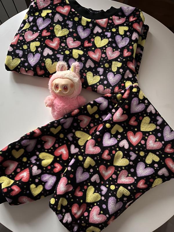 Тепла флісова піжама з яскравими серцями Затишна дитяча піжама з м’якого флісу. Дуже приємна до тіла, тепла та комфортна для прохолодних вечорів. Чорний фон із яскравими сердечками (рожевими, жовтими та ліловими) виглядає стильно та по-дитячому мило. Комплект складається з кофтики та штанів. Матеріал еластичний, не колеться, добре тримає форму. Стан: відмінний, без дефектів. Ідеально для дому, сну 🧸 Довжина кофточки 60 см Ширина під руками 43 см Довжина рукава від плеча 53 см Довжина штанців 93 см 💜
