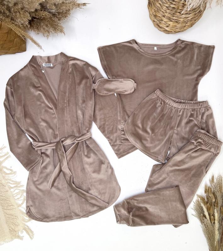 через кнопку купить только полная оплата!!! арт 7092 Велюровая пижама из 5 предметов СУПЕР КОМПЛЕКТ! -халат с поясом и карманами -футболка -шорти -брюки с карманами -маска на глаза ОТМЕННАЯ КАЧЕСТВО! рост/длин.халата/пог/рукав от горловины/длин.ф./пог/длин.шорт/пот/дл.штанов/крок/пот/поб похибка+-2см 140/75/49/58/52/41/29/28/88/67/27/49-1шт 146/78/50/61/53/42/31/30/92/70/29/50-1шт