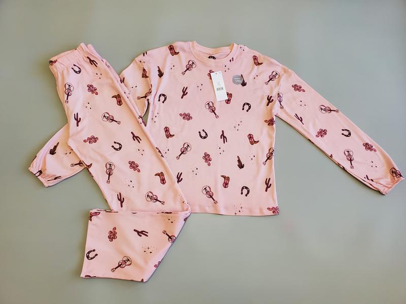Нежная розовая пижама с длинным рукавом и брюками. Принт с ковбойскими мотивами: подковы, шляпы, кактусы. Размер 158-164 на 13-14 лет Идеальна для сна и отдыха. Цена-580 грн