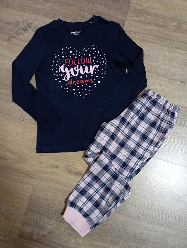 Замечательная хлопковая пижамка на девочку от брендового производителя lupilu.Теплёнка,штанишки из фантастической ткани, мягкие,тепленькие и приятные к телу.Шнурок рабочий Размер 110-116 полномерный Кофта: длина 47см, пог 34см, рукав 41см. Брюки: длина 67см, шаг 50см, пот 26см, пост 40см.
