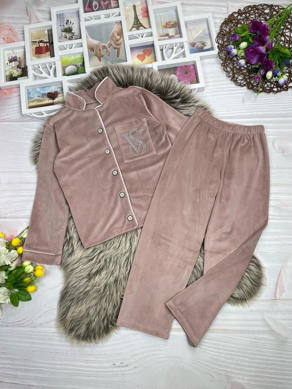 Стильна піжама з королівського велюру для красунь 💞 Тканина м’яка і приємна до тіла Сорочка на ґудзиках + брюки на резинці На сорочці кишеня оздоблена камінчиками, не відпадають Ідеальний варіант для подарунку 💝 Заміри: довжина сорочки/пог/рукав від плеча/довжина штанів/крок/пояс 128 - 48/42/46. 75/52/26 134 - 51/42/47. 79/57/27 140 - 52/44/51. 84/59/27 146 - 54/44/54. 87/62/28 152 - 56/47/55. 90/65/29
