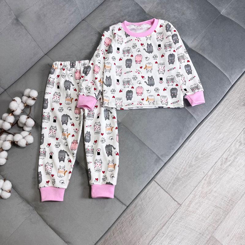 💕Пижама Котики. Ткань интерлок, тянется, хорошего качества. Рисунок - принт. Есть манжеты на рукавах и штанишках. Ткань Турция. Выработка Украина. 📐Замеры: 98 - кофт. длин.35 / полуобхв.30 / рукав.31 / брюки длиннее. 50 / крок 32 💰Цена 430 грн 110 - кофт. довж. 41/ полуобхв.31 / рукав. 37/ штани довж. 61 / крок 40 💰Цена 485 грн