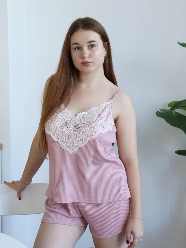 Артикул 9999 - цвет - графит, розовый - в комплект входит майка и шорты - отделка кружевом - тканина - рубчик - украинское производство - шорты на резинке, майка свободного кроя - бретели регулируются - ткань очень эластичная ✂️Размер по сетке: 2ХЛ