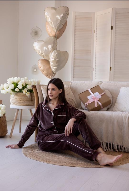 через кнопку купить только полная оплата!!! Уютная пижамка,чужный комплект для дома ткань королевский велюр, очень хорошо тянется, приятная к телу и очень мягкая на кофточке по всей длине есть пуговицы и один накладной карман, в поясе на резинке, красиво тянется,е карманы цвет ШОКОЛАД 🍁146-длина рубашки 55,рукав от плеча 52, пог 46, длина брюк 86, крок 65,поб 43 🍁152-длина рубашки 58,рукав от плеча 54, пог 47, длина брюк 90, крок 68, поб 45 Греб