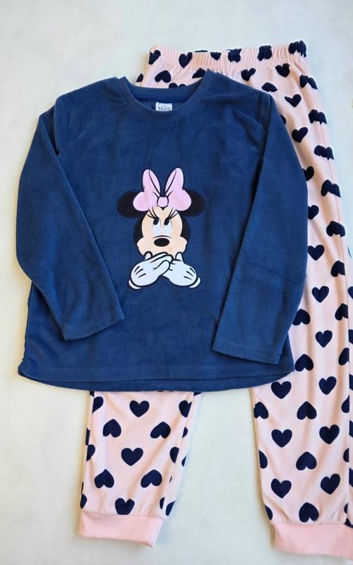детская велюровая пижама (домашний костюм) с изображением персонажа Диснея - Минни Маус. Комплект состоит из двух частей: Верх: темно-синий лонгслив (кофта с длинными рукавами) с принтом Минни Маус по центру. Низ: светло-розовые брюки с набивным рисунком в виде черных сердечек.