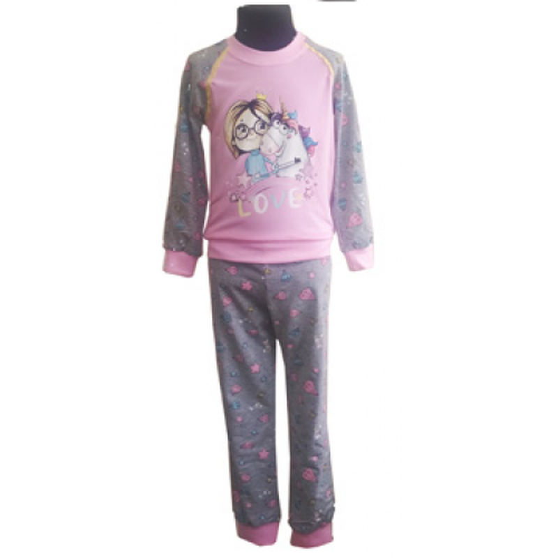 Качественная пижамка для девочки штаны и кофта с манжетами. Серо-розового цвета с рисунком девочки. Размер 152. ПОГ-40, длина кофты-59, рукав - 63 Длина брюк -92, пос-43, резинка -27