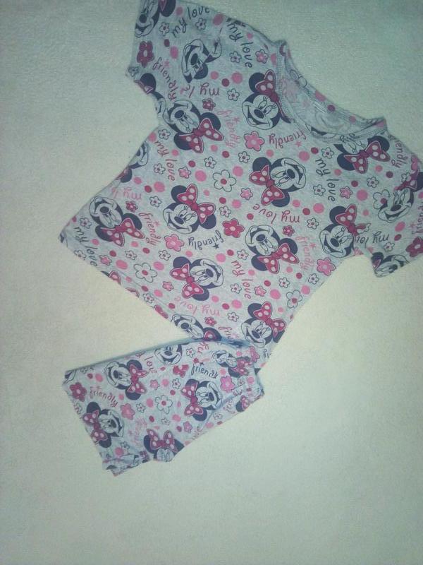 Летняя пижамка с Минни,рассчитана на 4-5 лет.Цвет серый с мордашками,ткань 100% котон.Дефектов и пятен нет.Замеры по требованию