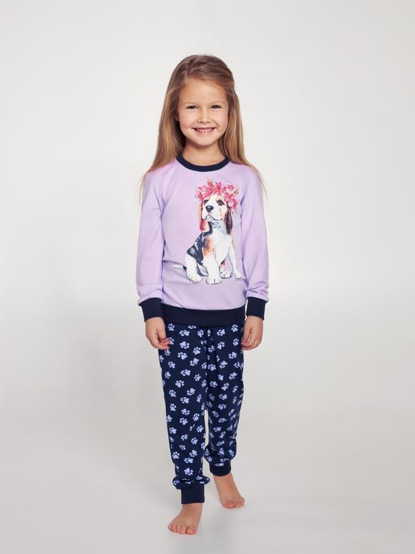 Комплект домашний для девочки выполнен хлопка с добавлением эластана. Состоит из футболки с длинным рукавом и брюк. Футболка спереди декорирована рисунком, горловина круглая. Брюки на манжетах. Состав: 95% хлопок, 5% эластан