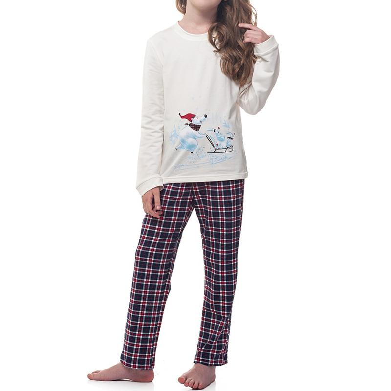 Уютный домашний комплект для девочки из новогодней коллекции, состоящий из: футболки с длинным рукавом и брюк на мягкой резинке. Комплект отшит из качественного материала, который обеспечит длительную и комфортную носку. Футболка декорирована забавным рисунком, брюки в шотландскую клетку. Состав: 95% хлопок, 5% эластан