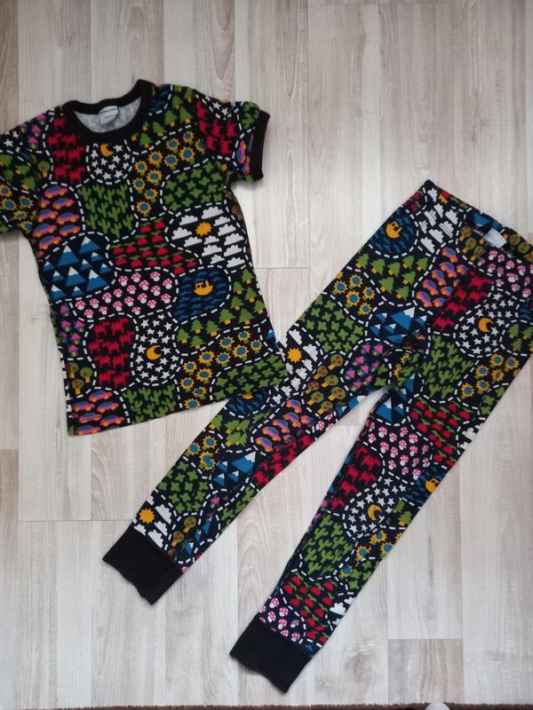 Хлопковая пижама плотный хлопок на 110-116см замеры плечи-26 пог-30 длина-43 пояс-24 длина-67 шаг.шов-44 состояние хорошее на попе есть пятно(на фото показано)цвет чуть подстиран возврата нет 100% оплата на карту Приват Банка отправляю Укрпочтой и НП Наложенный платеж только НП по предоплате! Бронь держу сутки !