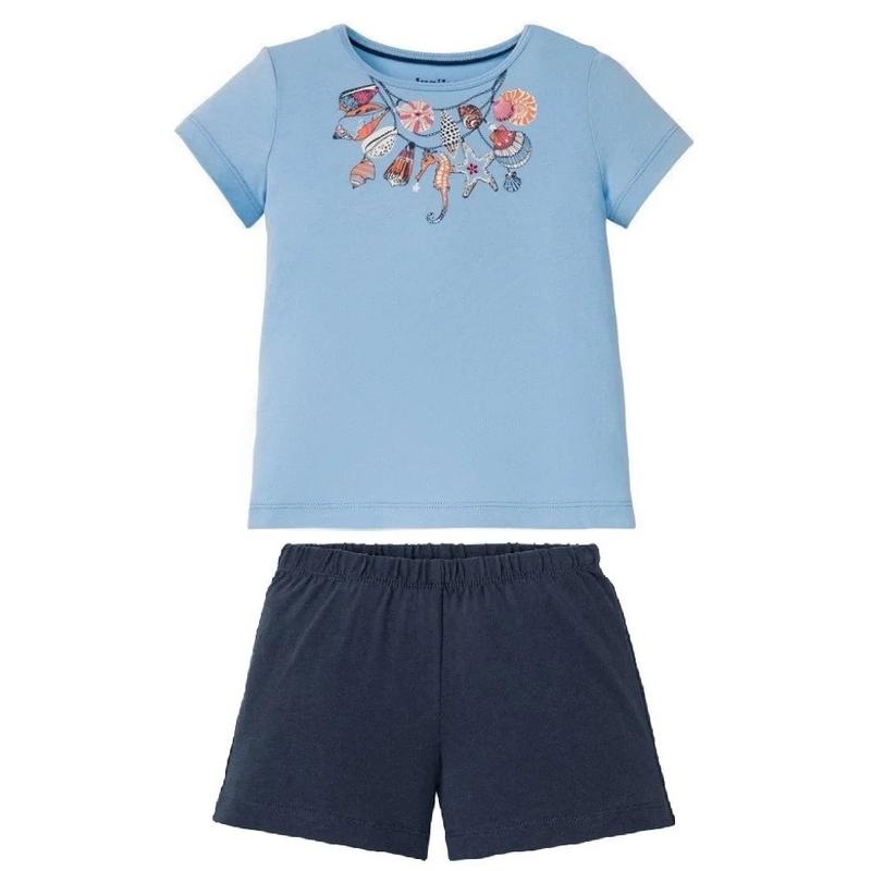 325961 Летняя детская трикотажная пижама для девочки. Комплект состоит из шортиков и футболки. Мягкая и приятная на ощупь ткань. Удобные шорты с мягкой резинкой. В гардеробе каждого современного ребенка непременно должна быть стильная и комфортная пижама, которая обеспечит ему оптимальные условия для крепкого сна. Пижама от европейского бренда Lupilu непременно придется по вкусу вашему ребенку. Костюм изготовлен из натурального материала, который надежно сохраняет оптимальную температуру тела, позволяет коже дышать, очень приятный на ощупь. Пижама свободного кроя не стесняет движения, поэтому в ней комфортно не только спать, но и ходить по дому. Цвет: Голубой Состав: 100% хлопок В наличии рост 110 / 116 (4-6 лет) Рост 110 / 116 - Длина футболки от плеча 46 см, ПОГруди 32 см, длина шорт 29 см, по внутреннему шву 10 см, ПОТалии 25 см, ПОБедер 35 см.