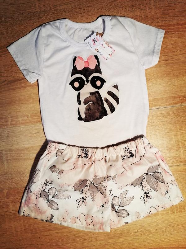 Нежный комплект из хлопка для маленькой принцессы, состоящий из футболки с принтом и свободных шортиков. Футболка однотонная белого цвета с оригинальным принтом. 100% хлопковый состав позаботится о комфорте Вашего ребенка, а принт создаст отличное настроение. ❤️ Цвет: 🦝 Футболка - принт енот 🦝 Шорты - цветочный принт Размер: рост 92 см. Cостав: 💯 % хлопок