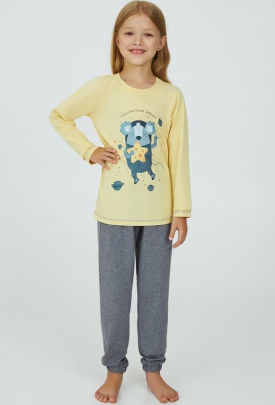 Детская пижама для девочки от украинского бренда Ellen. Пижама выполнена из качественного и мягкого хлопка, состоит из кофты желтого цвета и серых штанов. Кофта свободного кроя, с длинными рукавами и круглым вырезом горла, штаны с мягкой резинкой в поясе, внизу на манжетах. Спереди по центру кофты украшена забавным принтом коалы в космосе и надписью "Follow your dream". Пижама очень красивая и комфортная. Состав: 95% хлопок, 5% эластан.