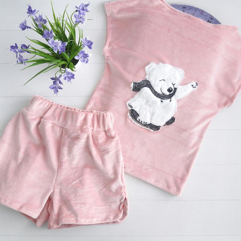 Пижама (футболка + шорты) ⭐Ткань : велюр ⭐Цвет: пудра ⭐Дополнительно: пришита меховая аппликация "мишка" ⭐Производитель Украина р. 34(примерно 134)-длина футболки 47 см /ПОГ 34 см/длина шорт 29 см/шаг 6 см-2шт р.36(примерно 140)-длина футболки 49 см /ПОГ 36 см/длина шорт 30 см/шаг 7 см-2шт р.38(примерно 146)-длина футболки 51 см /ПОГ 37 см/длина шорт 30 см/шаг 7 см-2шт р.40(примерно 152)-длина футболки 54 см /ПОГ 39 см/длина шорт 31 см/шаг 7 см-2шт р.42(примерно 158)-длина футболки 56 см /ПОГ 40 см/длина шорт 31 см/шаг 7 см-2шт.коса