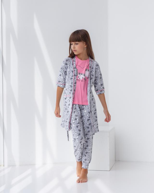 ЗАМЕРЫ (Халат: полуобхват груди / длина / длина рукава. Футболка: полуобхват груди / длина кофты / длина рукава. Штаны: полуобхват бедер / длина штанов / внутренний шов): 8-9(34/66/27/36/48/12/39/77/56); 12-13(40/72/30/39/54/17/43/88/63)см