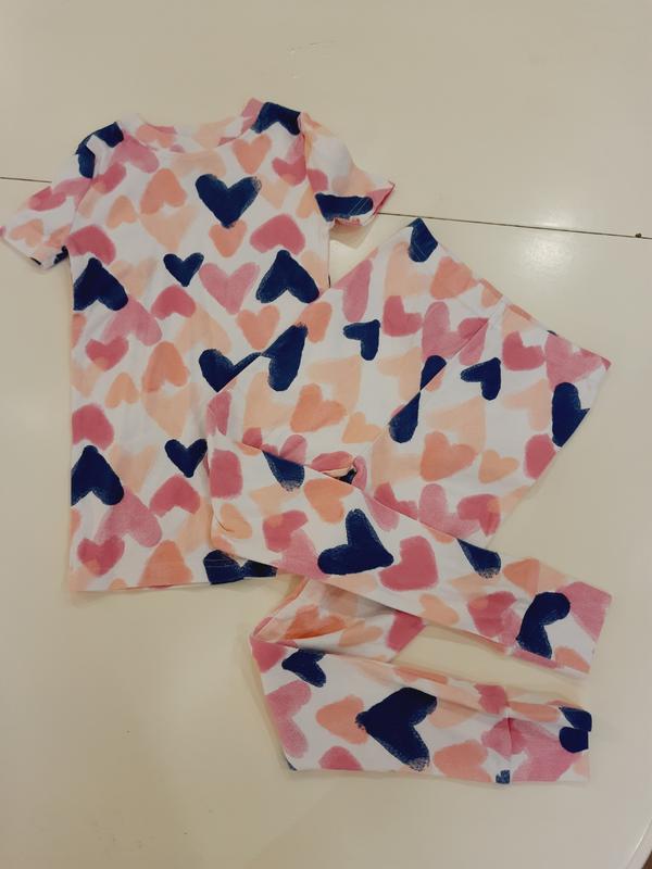 Новенькая стоковая пижама на девочку 5-6лет. Длина футболки по спинке 47см, ширина под мышками 27см, длина штанины от пояса до низа 70см, длина от пояса до памперса 24см, длина шага 50см, талия 25см.