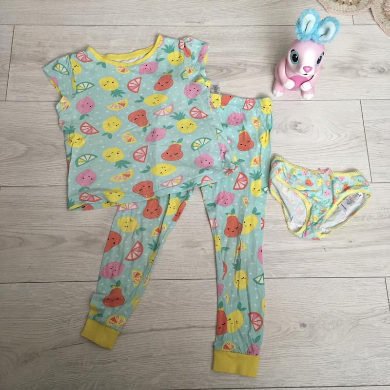Яркая пижама в лимончики. Состояние хорошее, но есть пару пятнышек. ребенок ее очень любил) Приятная к телу. Возраст по бирке 4-5, по факту как по мне на 3-4. Трусишки подойдут на худенькую девочку.